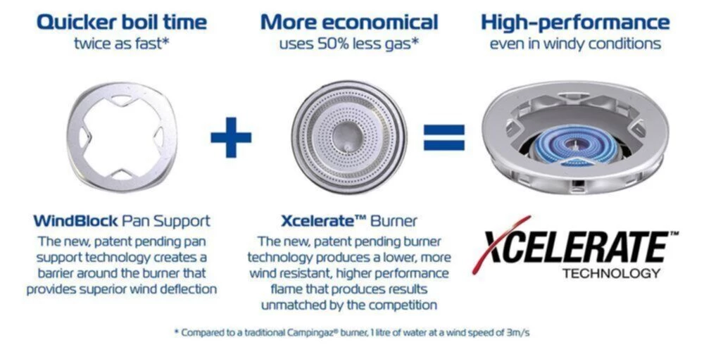 - Halves boil time in higher wind speeds compared with standard burners.