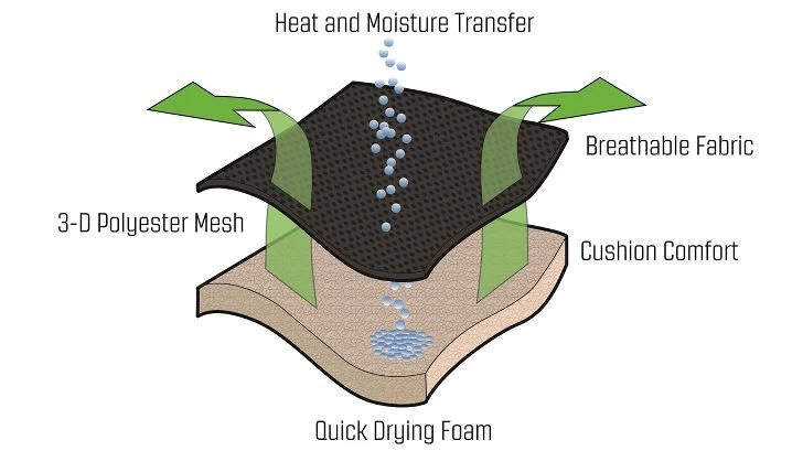 - Fabric:ย Textiline, 3D mesh with quick-dry foam, 100% polyester