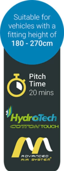 The Westfield Orion 300 Performance Air DriveAway Awning, is the perfect small addition to your campervan that will make life on your holiday much more comfortable by providing versatile extra space. With multiple tunnel options it can fit vehicles with a height between 180 to 270cm tall, so if you decide to change your vehicle you have the option to buy a new tunnel that will allow the awning to fit to it without having to replace the entire thing. It features a luxury HydroTech Cotton Touch flysheet, which is a premium, all weather fabric that will last for many years, the high performance coating also gives the Orion an extremely high weathrproof rating to protect you from the elements. The side panels of the Orion are removable, and offer an optional extra annex, perfect for use as a bedroom or a bit of extra storage space.